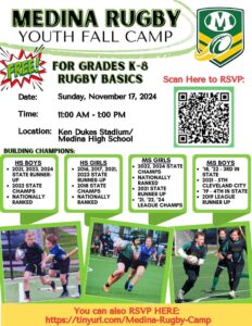 We are excited to host a FREE Youth Rugby Camp on November 17th from 11:00am-1:00pm at Ken Dukes Stadium! This camp is open to boys and girls in grades K through 8, whether you’re already part of Medina Rugby, interested in learning about rugby, or just want to have some fun! Bring your friends and family— everyone is welcome!