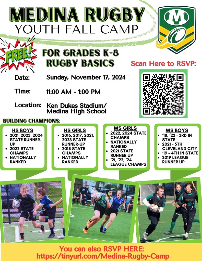 Medina Rugby will be hosting a free youth rugby camp for boys and girls in grades K-8 on Sunday, October 8th from 5pm-7pm at Ken Dukes Stadium at Medina High School. During this non-contact camp, all participants will learn the basic fundamentals of rugby through games and drills led by Medina Rugby coaches.